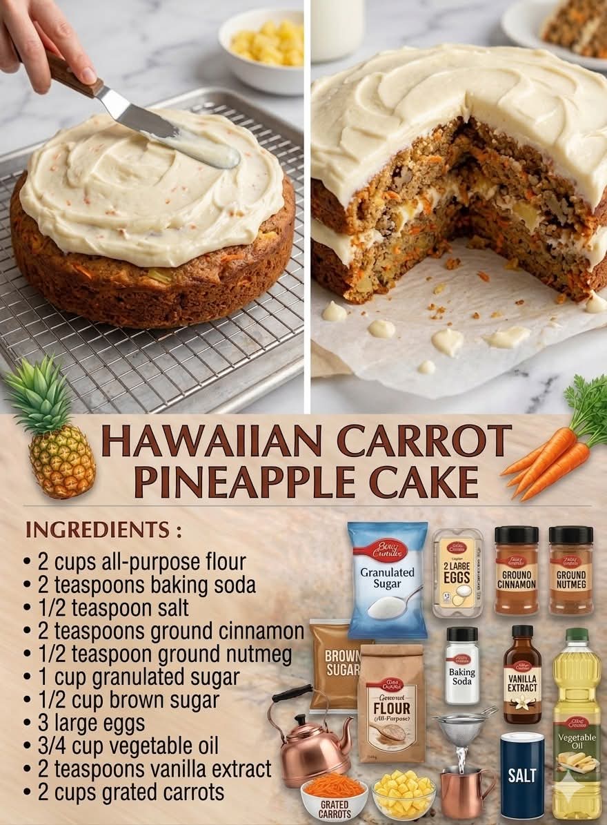 Here’s your full, rich, bakery-style recipe for 🍍🥕🍰 Hawaiian Carrot Pineapple Cake—expanded with everything you asked for: introduction, history, methods, and more 👇