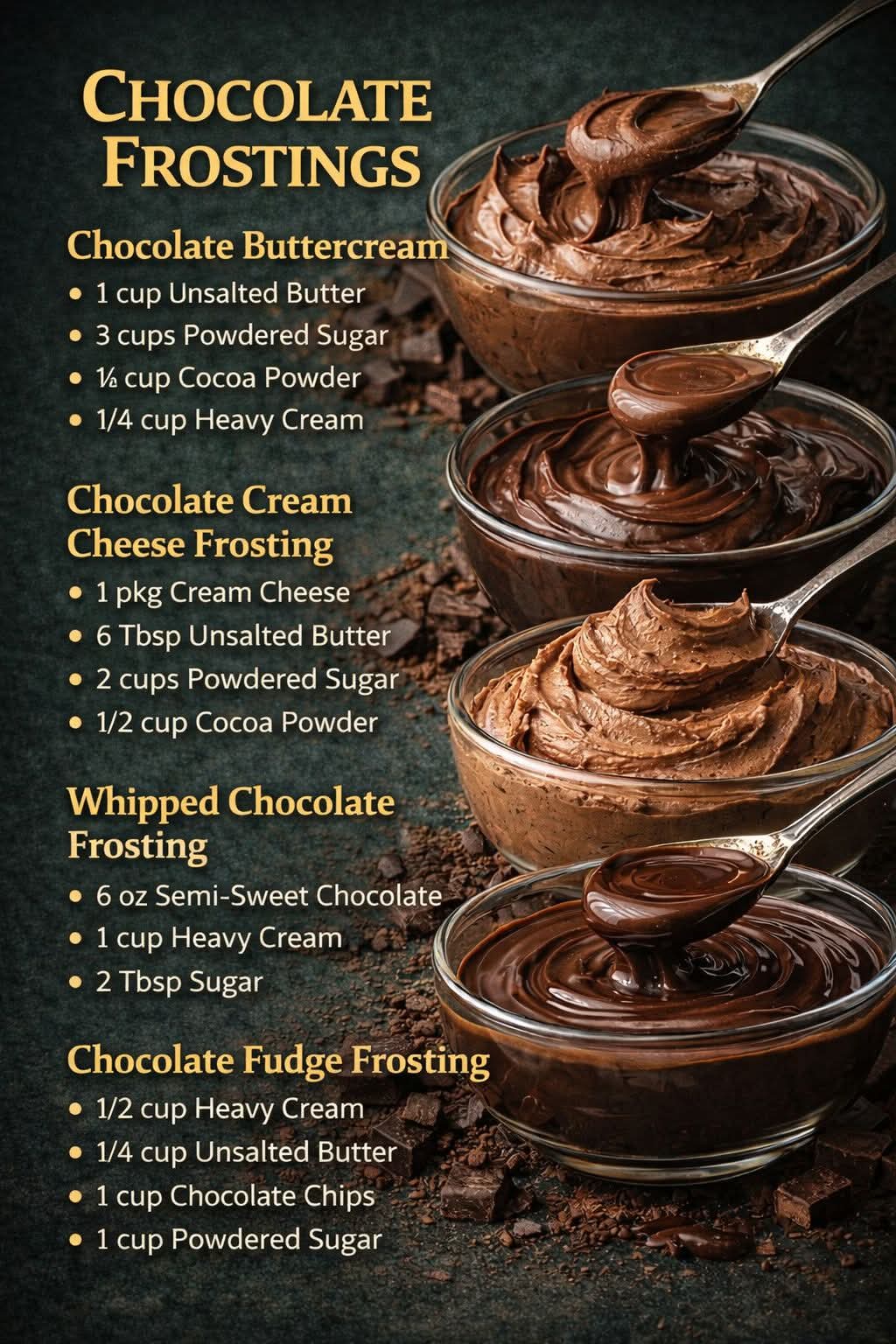 Chocolate has enchanted dessert lovers for centuries, and few things celebrate it better than a luscious frosting. From silky buttercreams to airy whipped toppings, chocolate frostings elevate cakes, cupcakes, brownies, and cookies into extraordinary treats. This guide covers four iconic chocolate frostings: Chocolate Buttercream, Chocolate Cream Cheese Frosting, Whipped Chocolate Frosting, and Chocolate Fudge Frosting — each with its own texture, richness, and charm. Whether you’re baking for a special occasion or just indulging a sweet craving, these frostings bring chocolate dreams to life.