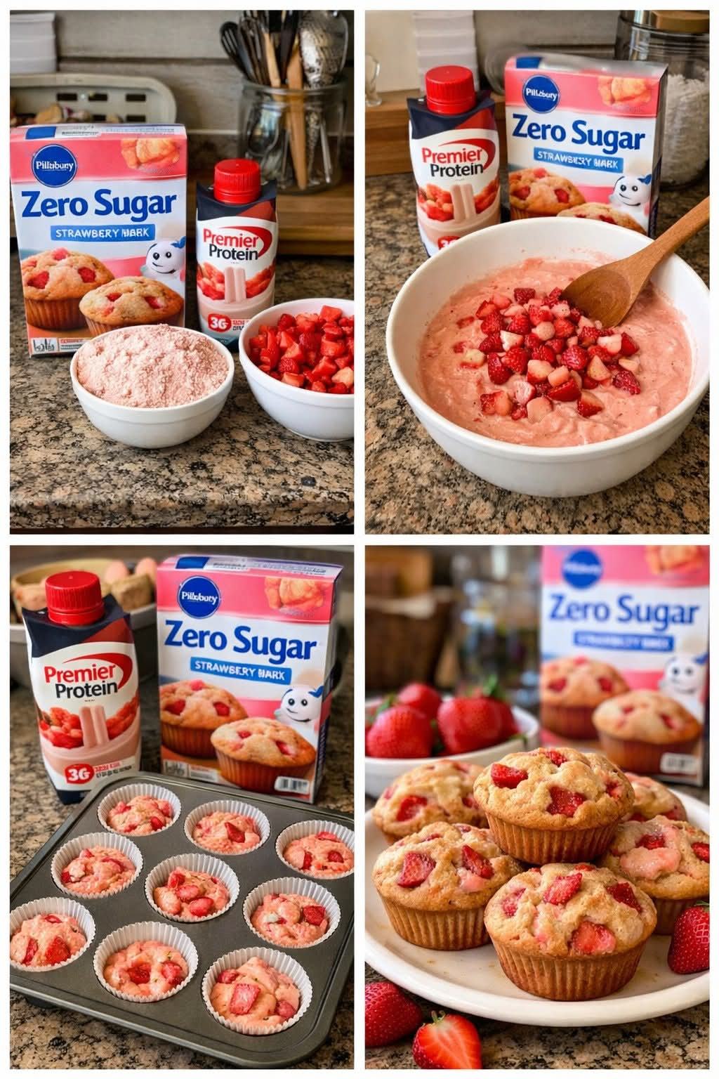 Formation in this recipe is simple yet effective: a muffin mix ensures reliable rise and texture, protein shake adds structure and protein content, and fresh strawberries maintain moisture and fresh fruity flavor.
