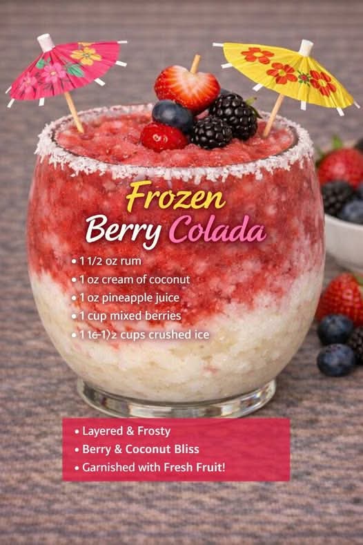 The Frozen Berry Colada is a vibrant twist on the classic tropical drink, combining the creamy richness of coconut with the sweet-tart burst of mixed berries. It’s icy, fruity, and incredibly refreshing—perfect for hot days, parties, or whenever you want a mini vacation in a glass.