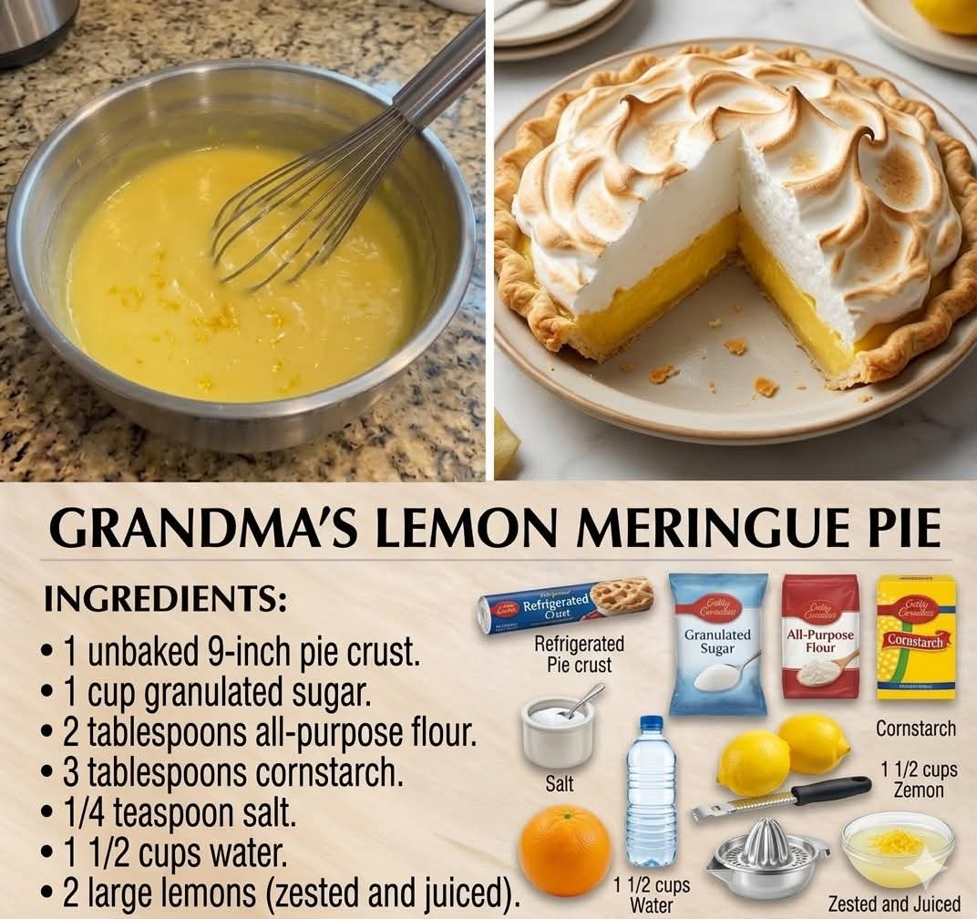 Few desserts evoke nostalgia quite like Grandma’s Lemon Meringue Pie. The crisp, buttery crust cradles a tangy, silky lemon filling, all topped with a cloud-like meringue that browns to perfection. Every bite is a harmony of sweet and tart, smooth and airy—making it a timeless favorite at family gatherings, holiday dinners, and cozy afternoons with tea. This recipe captures the classic version that has been passed down for generations, perfected by loving hands.