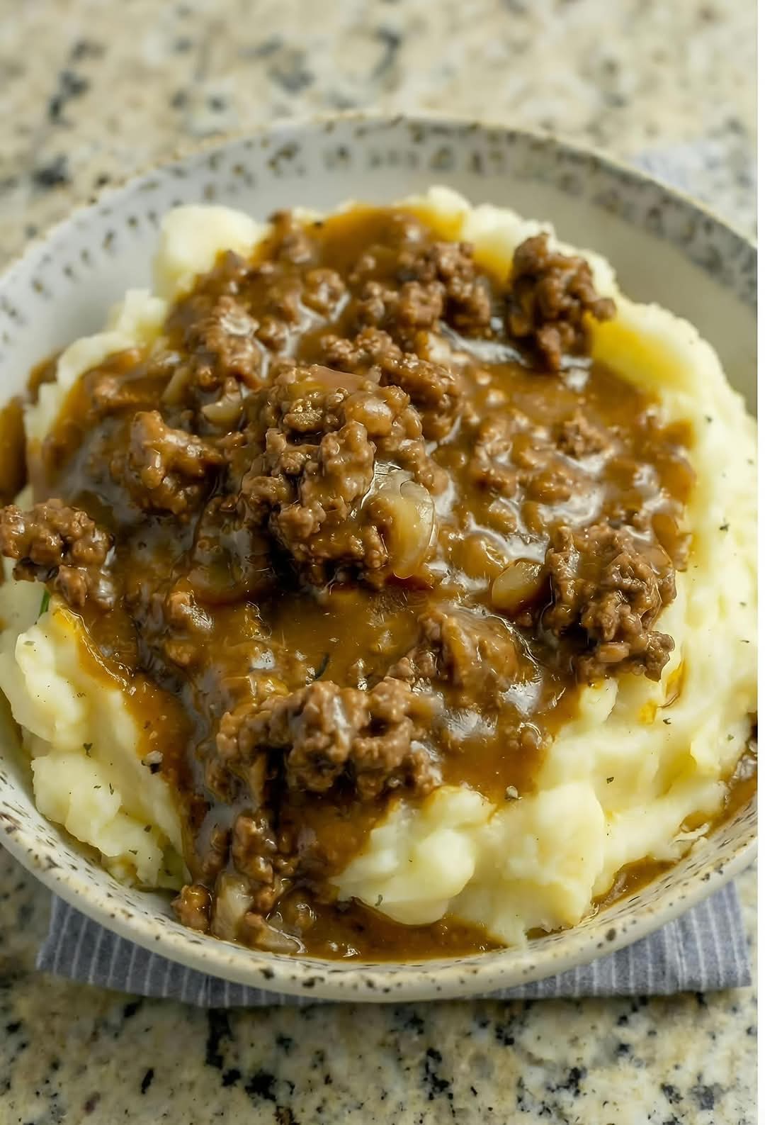 The contrast between smooth potatoes and chunky gravy creates the perfect bite.