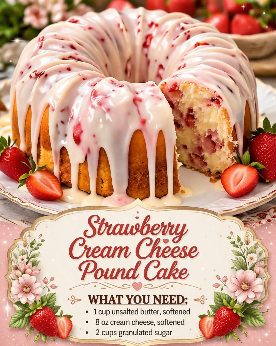 Here’s a rich, complete, and detailed version of your Strawberry Cream Cheese Pound Cake recipe 🍓🍰