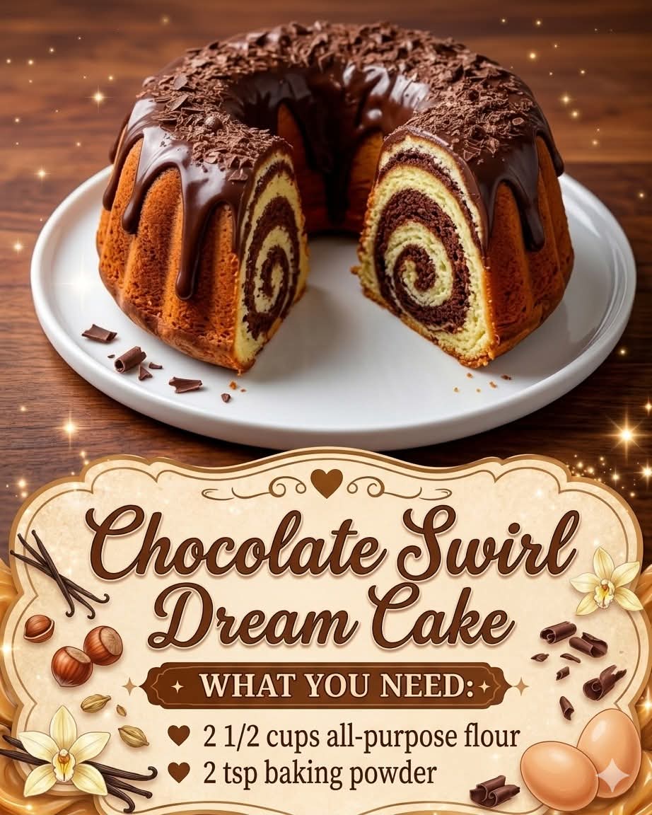 Chocolate Swirl Dream Cake is a beautiful and indulgent dessert that combines the best of both worlds—rich chocolate and soft vanilla cake in one stunning swirl. Each slice reveals a marbled pattern that looks as dreamy as it tastes. Moist, fluffy, and full of comforting flavor, this cake is perfect for special occasions or whenever you want a bakery-style treat at home.