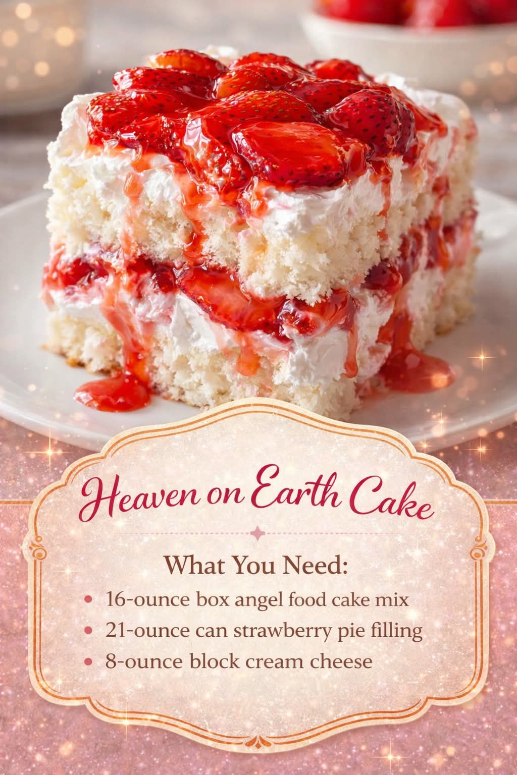 “Heaven on Earth Cake” is exactly what it sounds like—a light, creamy, fruity dessert that melts in your mouth and feels like pure bliss. Made with airy angel food cake, luscious strawberry filling, and silky cream layers, this no-fuss dessert is perfect for gatherings, celebrations, or simply treating yourself. It’s a beautiful combination of textures: fluffy, creamy, and slightly tangy, all in one heavenly bite.