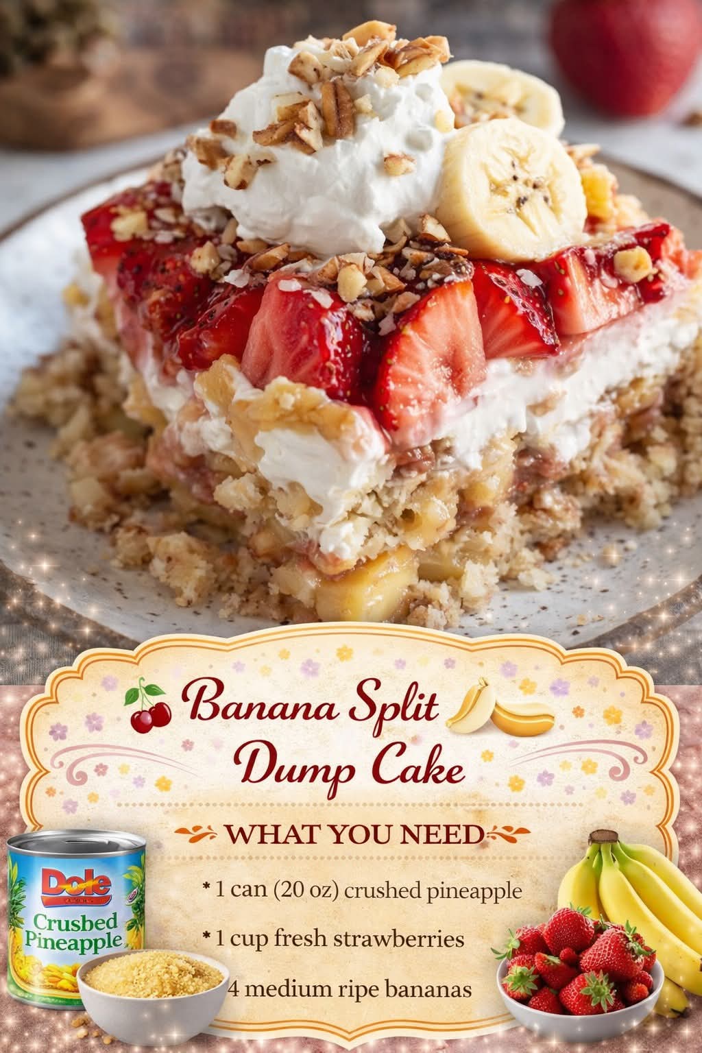 Here’s a rich, detailed, and complete version of your Banana Split Dump Cake recipe 🍌🍰✨