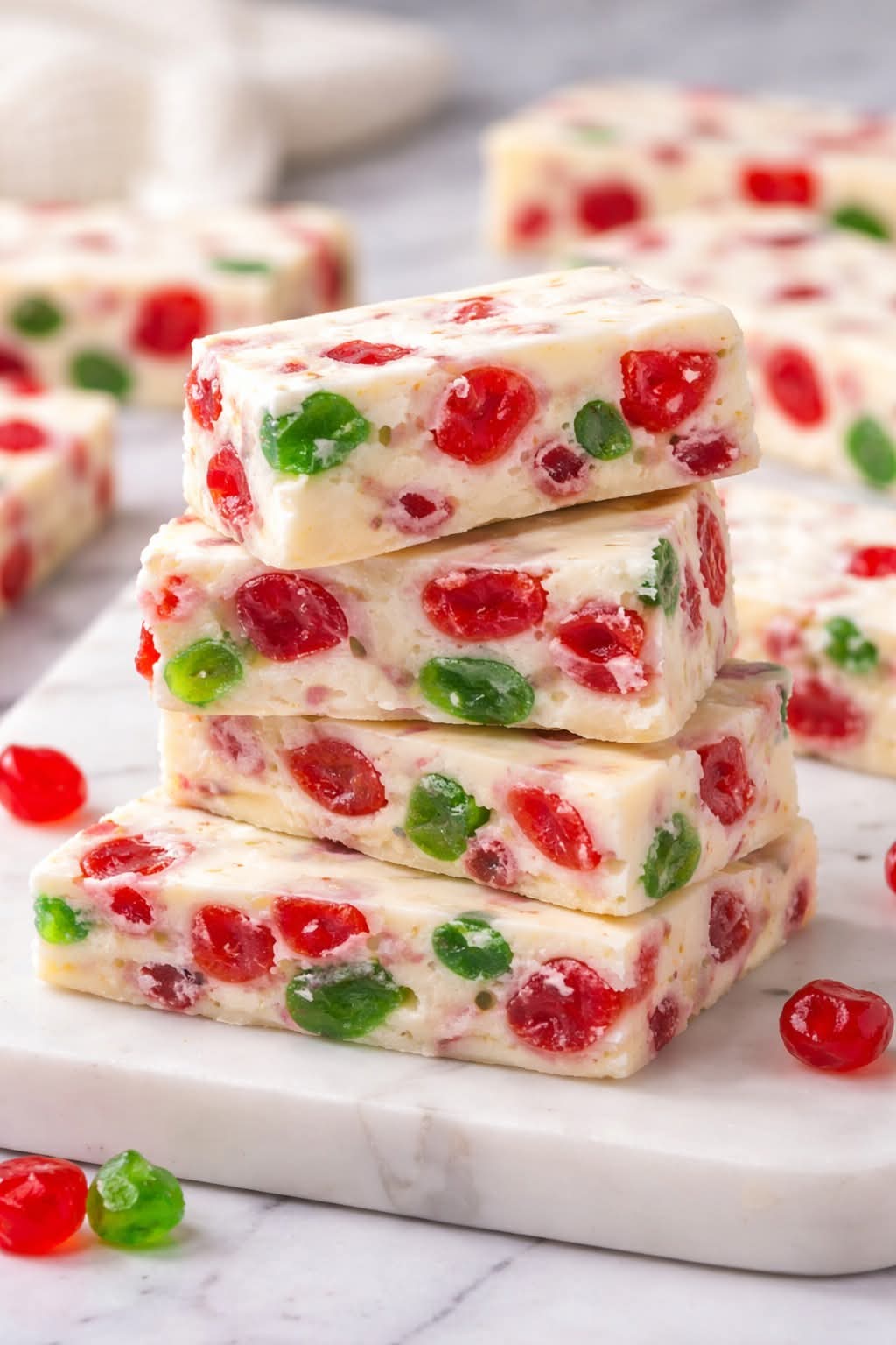Cherry nougat bars are a modern no-bake candy inspired by classic nougat confections and white chocolate fudge-style desserts. Instead of complicated candy thermometers or long cooking stages, this recipe uses melting and mixing to create a soft, sliceable treat.