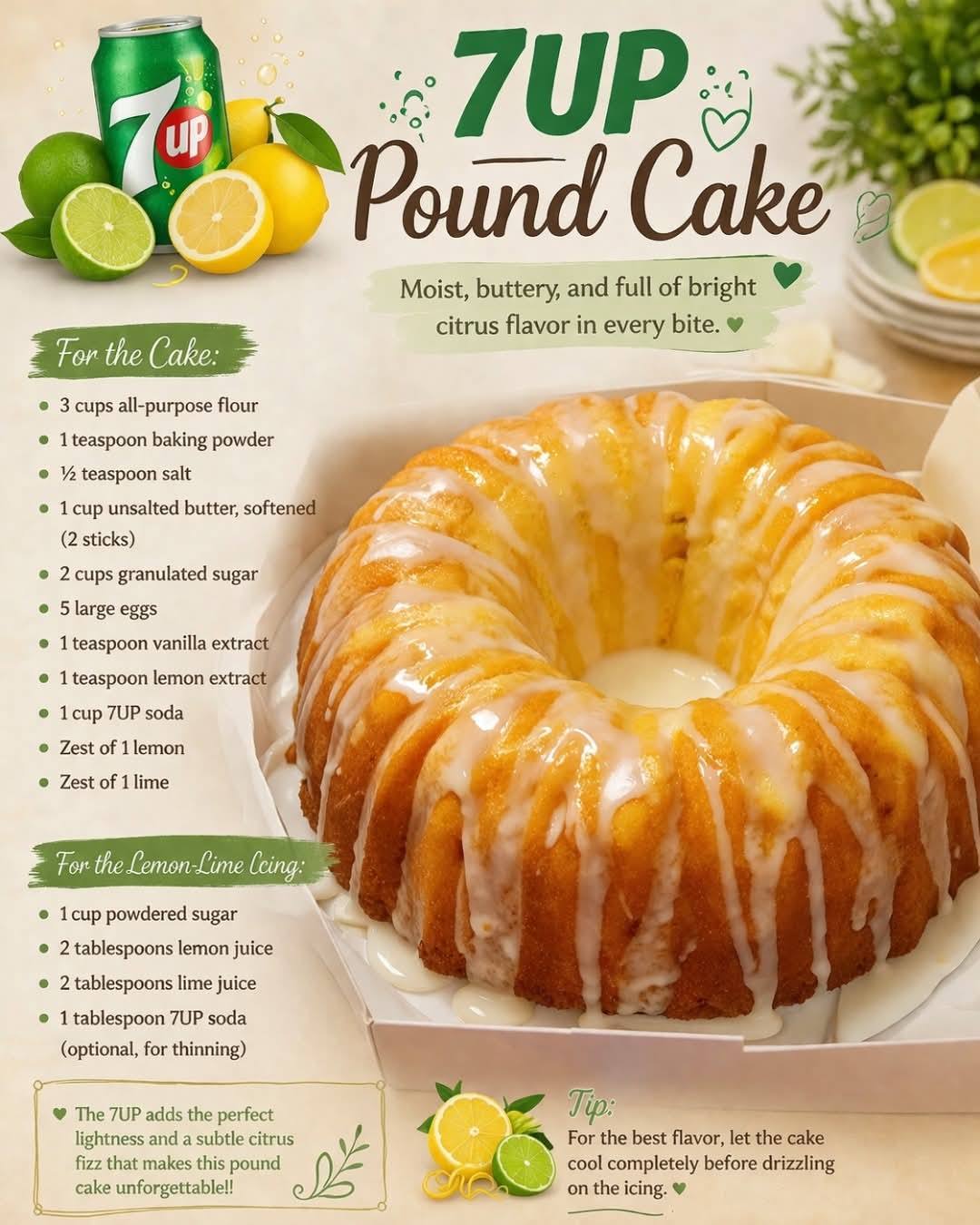 Here’s your full, rich, bakery-style 7UP Pound Cake recipe—with everything you asked for: introduction, ingredients, instructions, methods, history, formation, and a warm finish 🍋✨