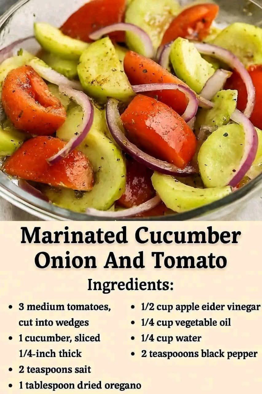 Here’s a complete, beautifully formatted recipe for Marinated Cucumber, Onion, and Tomato Salad — just as you requested, with all the extra sections you love. Don’t lose this one! 😍