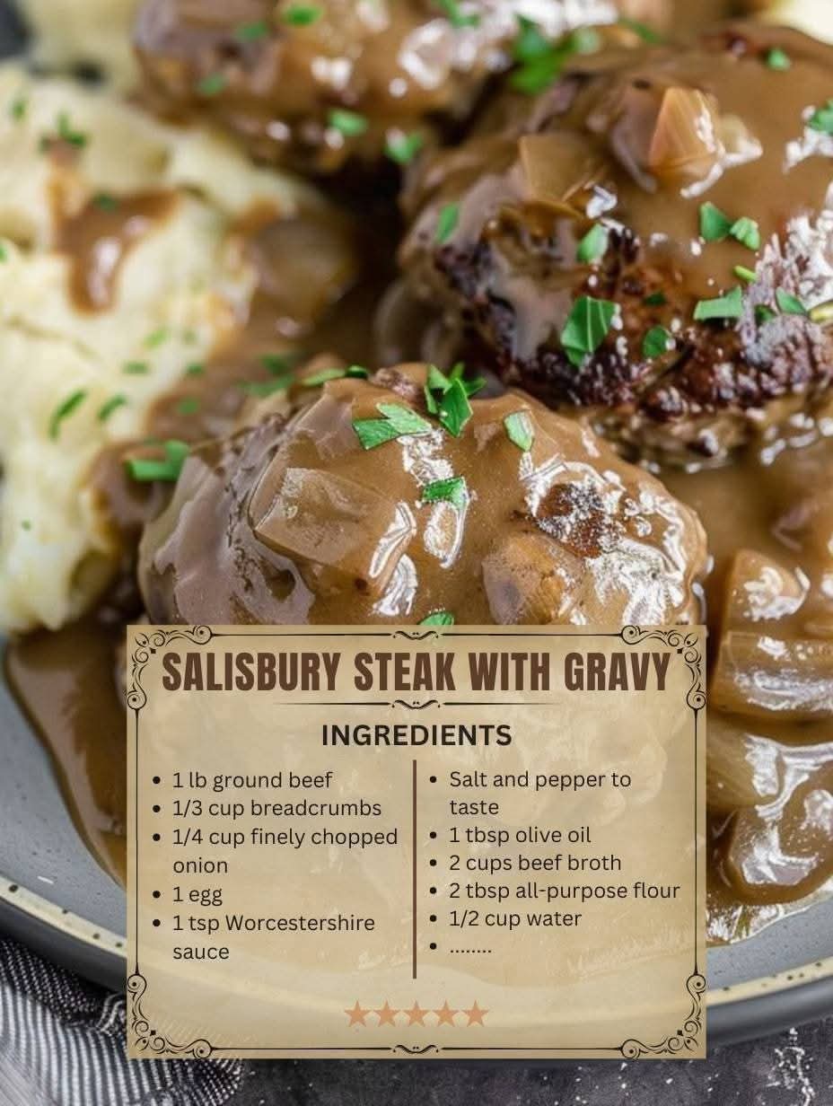 Salisbury Steak is a classic comfort food—seasoned ground beef patties simmered in a rich, savory onion gravy. Despite its name, it’s not a steak in the traditional sense but rather a flavorful meat patty. It gained popularity in the United States during the late 19th and early 20th centuries as a nutritious, affordable meal. Today, it’s served alongside mashed potatoes, egg noodles, or steamed vegetables for a hearty dinner.