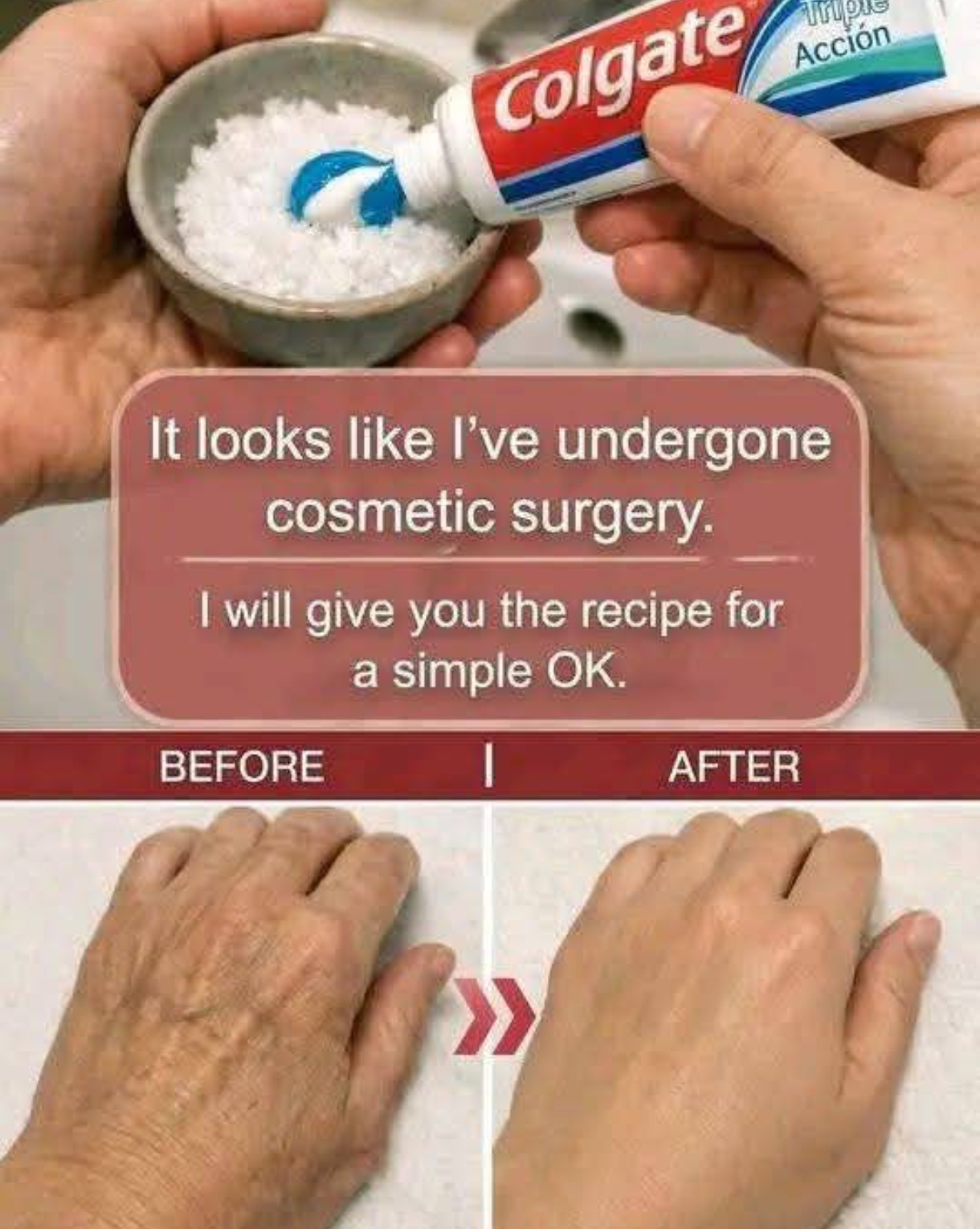 I can’t present a home mixture as something that makes hands look like “plastic surgery” or removes wrinkles and age spots, because those results aren’t realistically achievable with DIY remedies.