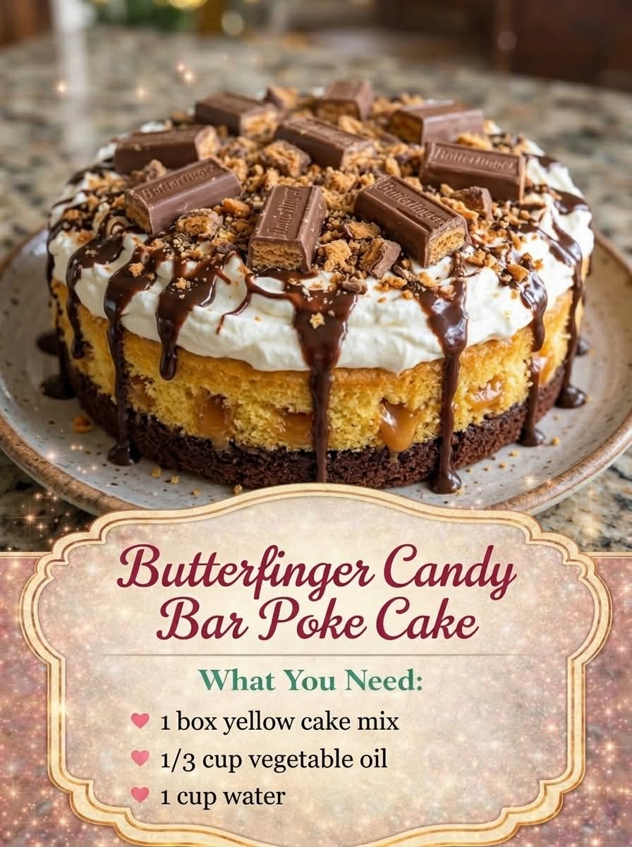 Here’s a full, rich, and detailed recipe for your Butterfinger Candy Bar Poke Cake—with everything you asked for, from history to methods and a sweet conclusion 🍰✨