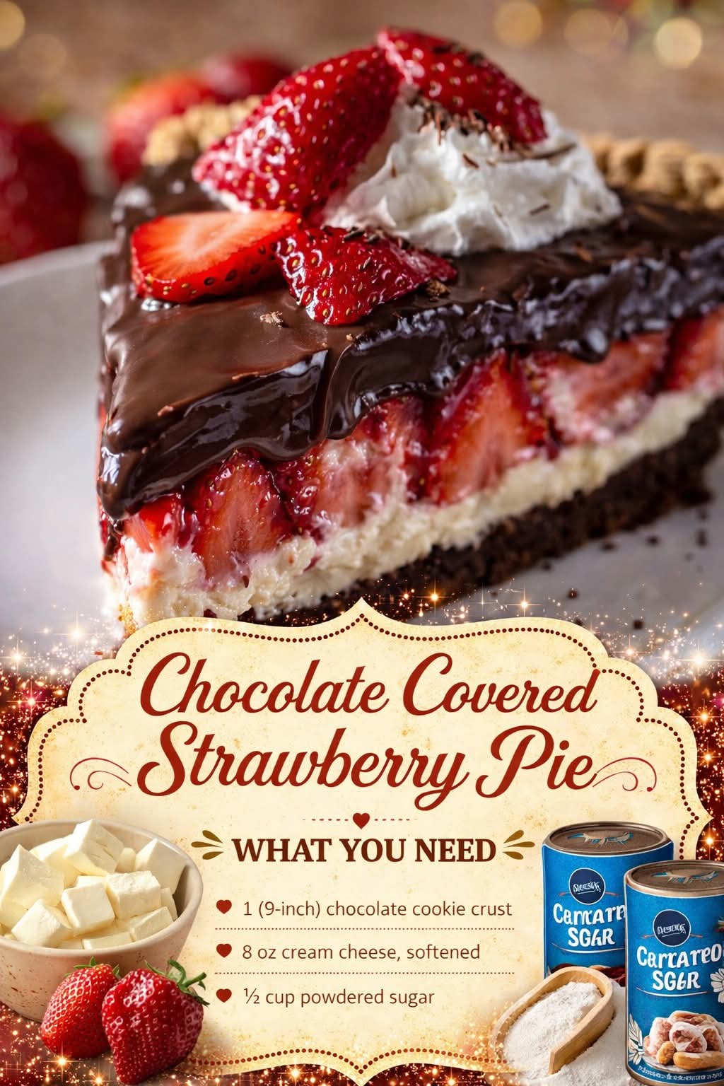 Here’s a full, rich, and detailed recipe for your Chocolate Covered Strawberry Pie—just the way you like it, with everything included 🍓🍫