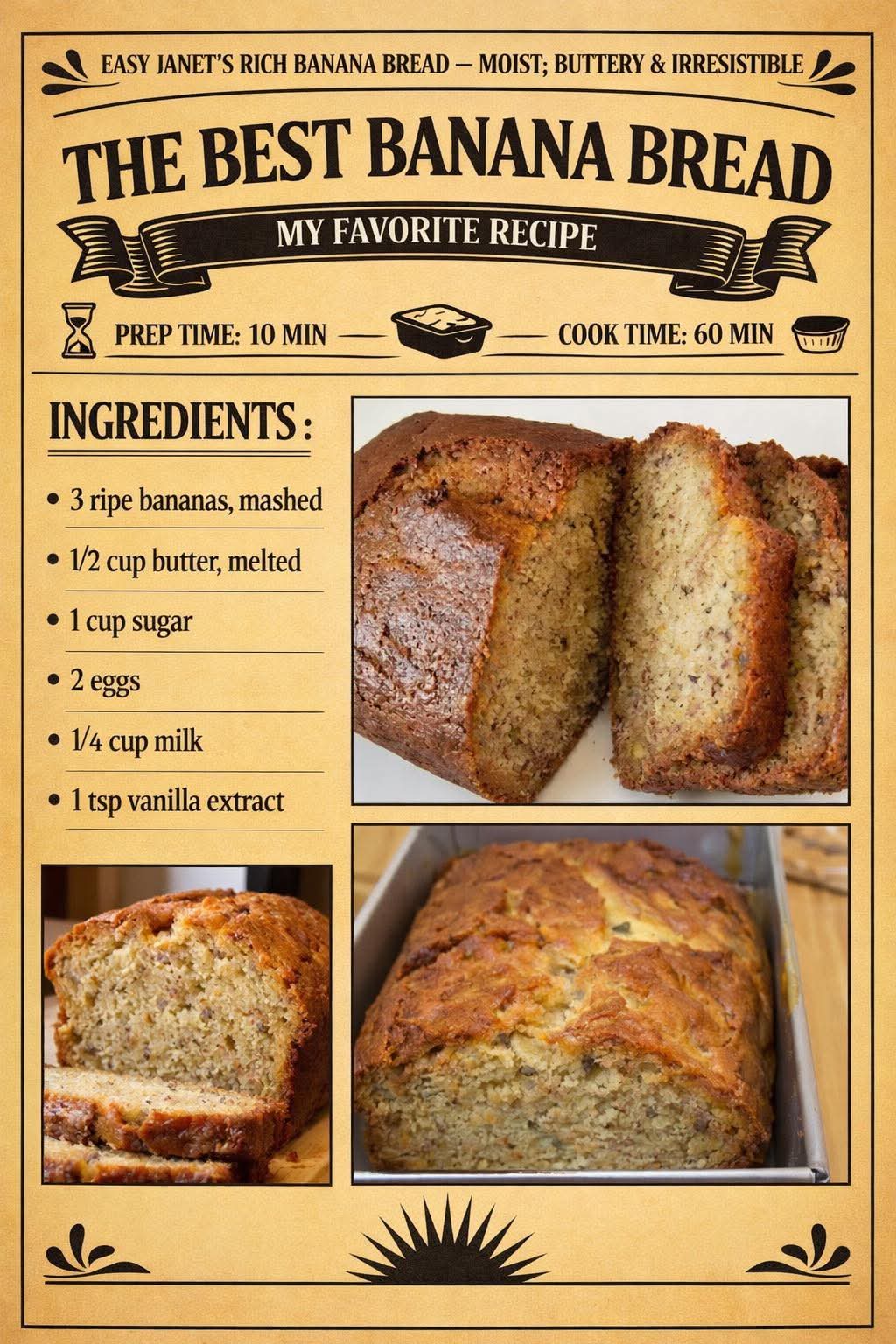 Banana bread is one of those timeless comfort bakes that fills the kitchen with warmth, sweetness, and nostalgia. Janet’s version is extra special — soft, buttery, and deeply moist with a rich banana flavor that tastes like home in every slice. Whether you enjoy it fresh out of the oven or toasted with a little butter the next day, this banana bread never disappoints.
