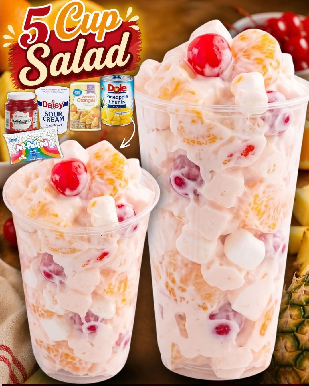 5 Cup Salad proves that simple ingredients can create something truly special. Whether you’re making it for a celebration or just a sweet treat at home, it’s a reliable, crowd-pleasing favorite that never goes out of style. One bowl, five ingredients, and a whole lot of happiness in every bite 🍍✨