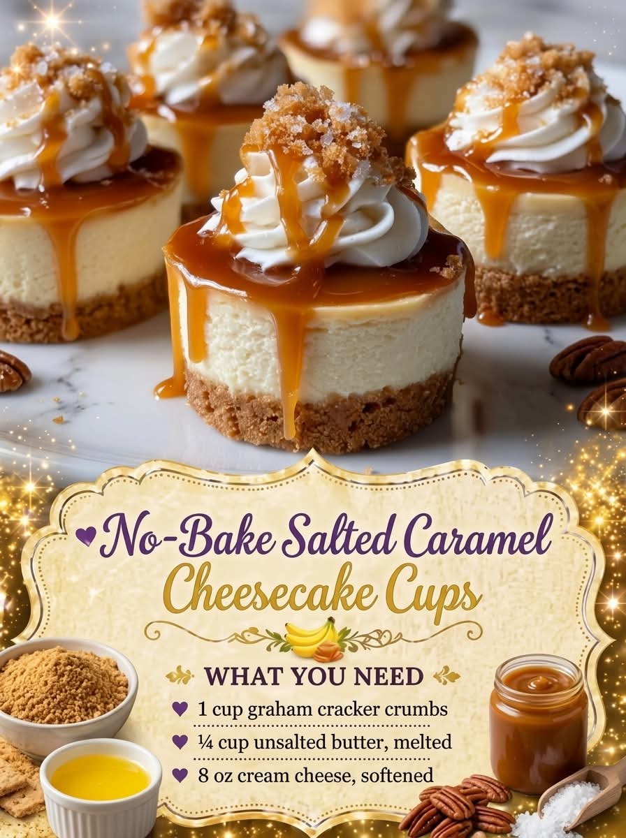Here is your full, rich version of No-Bake Salted Caramel Cheesecake Cups with all the sections you requested: