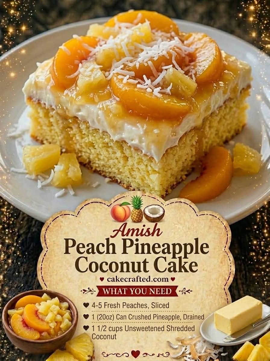 This Amish Peach Pineapple Coconut Cake is a beautiful fusion of old-fashioned comfort and tropical sweetness. Inspired by traditional Amish baking—known for simple, hearty, and wholesome desserts—this cake brings together juicy peaches, tangy pineapple, and sweet coconut into one incredibly moist and flavorful treat.